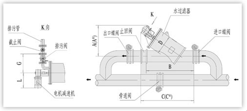 型號(hào) | 管徑 (mm) | 過(guò)濾流量 (m3/h) | 過(guò)濾面積 (cm3) | 排污閥DN (mm) | 一次清洗 水量(L) | 電機(jī)功率 (KW) | 重量 (Kg) | D (mm) | A (mm) | A (mm) | B (mm) | C (mm) | C (mm) | L (mm) | G (mm) |