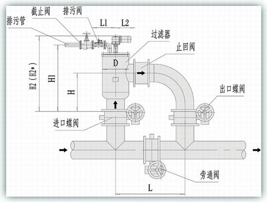 型號(hào) | 管徑 (mm) | 過(guò)濾 流量 (m3/h) | 過(guò)濾 面積 (cm2) | 排污 閥DN (mm) | 一次清 洗水量 (L) | 電機(jī) 功率 (KW) | 重量 (Kg) | D (mm) | H (mm) | H1 (mm) | H2 (mm) | H2 (mm) | L1 (mm) | L2 (mm) | L (mm) |