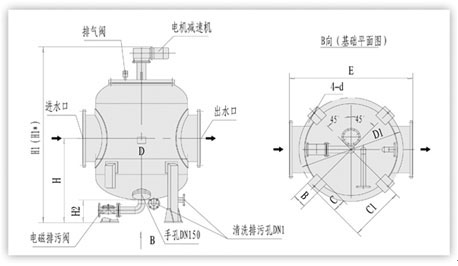 型號(hào) | 管徑 mm | 過(guò)濾 流量 m3/h | 過(guò)濾面積 cm2 | 電磁排污閥DN1 mm | 一次清洗水量L | 清洗排污閥DN1 mm | 電機(jī)功率 KW | 重量 Kg | D mm | H mm | H1 mm | H1 mm | H2 mm | E mm | D1 mm | B mm | C mm | C1 mm | D mm |