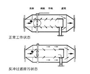 手動蝶閥開啟,即閥板平面與筒體軸線平行,(此時扳手亦與筒體軸線平行)排污閥關閉。此時水流從進口直接進入過濾網筒內部,經濾網過濾后由出口排出。2、反沖洗工作狀態